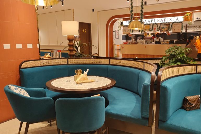 Wooden tables, plant vases, and plush seating create a welcoming, homely atmosphere. The space is decorated beautifully and thoughtfully with potted plants, funky frames bringing back nostalgia from different parts of South India, blending with pop culture, and walls painted in earthy tones of orange, blue, and cream colours on the walls. The venue has both indoor and outdoor seating.