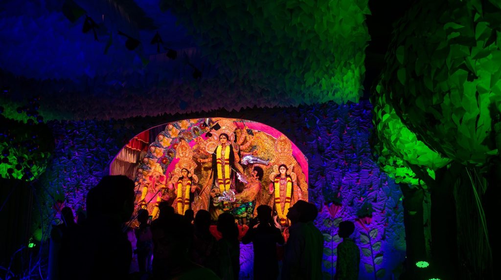 The true beauty of the pandals can be seen at night. These pandals have themes based on mythology and narrate epic tales. Many pandals these days also depict themes of social issues. There are dance performances, women dance with lit earthen lamps in their hands. Some of the big Durga Pujo pandals are Ekdalia Evergreen, Kumartuli Park, Suruchi Sangha, etc. There are 10 days of festivities in Kolkata, and people go shopping and eat Bengali sweets. It’s kind of a get-together where the entire city comes together in celebration and devotion.